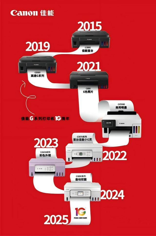 2025年,佳能(中邦)有限公司迎来了佳能G系列加墨式高容量打印机十周年(下称:佳能G系列十周年)的里程碑。佳能G系列打印机自2015年推出以后,通过性能迭代与体验优化,晋升产物逐鹿力,餍足家庭、影相喜好者、二次元喜好者、中小企业等区别用户需求,成为佳能喷墨打印机的中坚力气。
