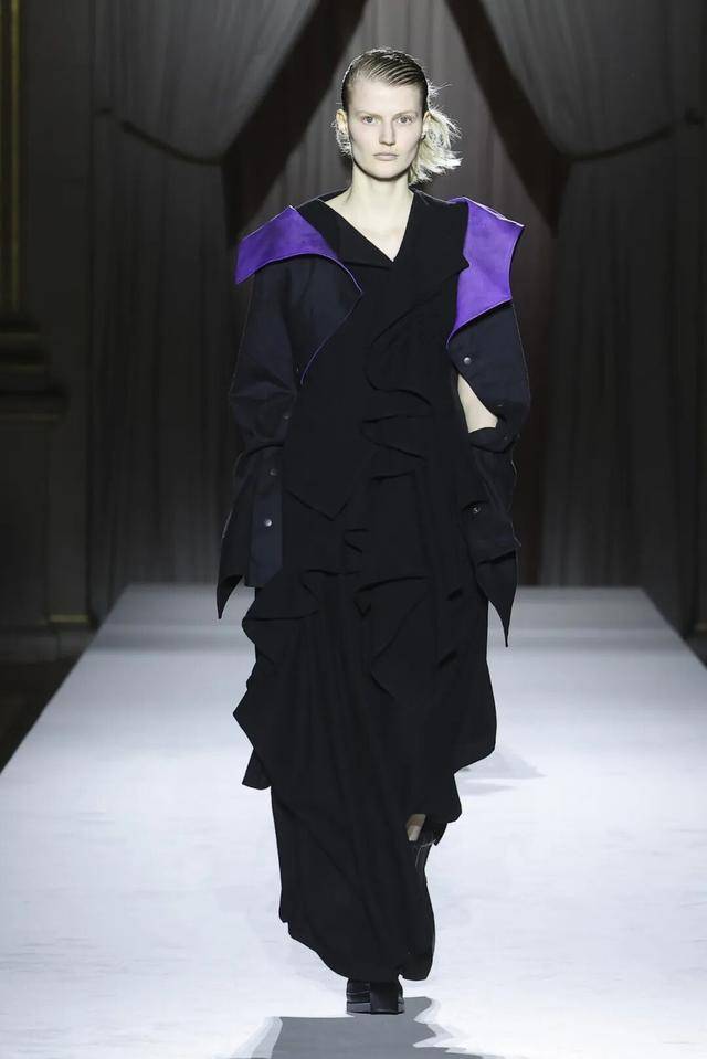 山本耀司的2025/26秋冬系列露出了女性衣橱的力气——当其被从新解说,既推向极致的边际又回归主流的重点。本系列以黑紫双色修筑计划语汇,紫色正在日本文明中素来标志显贵心胸,山本耀司借此颜色宣言女性力气,显现一种登峰制极的姿势。一系列裙装拉开序幕,囊括了贯穿女性衣饰史的经典元素,从半身短裙到束腰外套,从紧身胸衣到外衣,再到标记性的连衣裙。区别颜色与材质的装点,使衣物化作计划师的画布,使计划师兼具画家与成衣的双重脚色。而每一处迭加都是闭于方针的艺术——如岩层般的迭加,更具象了伟大愿景。