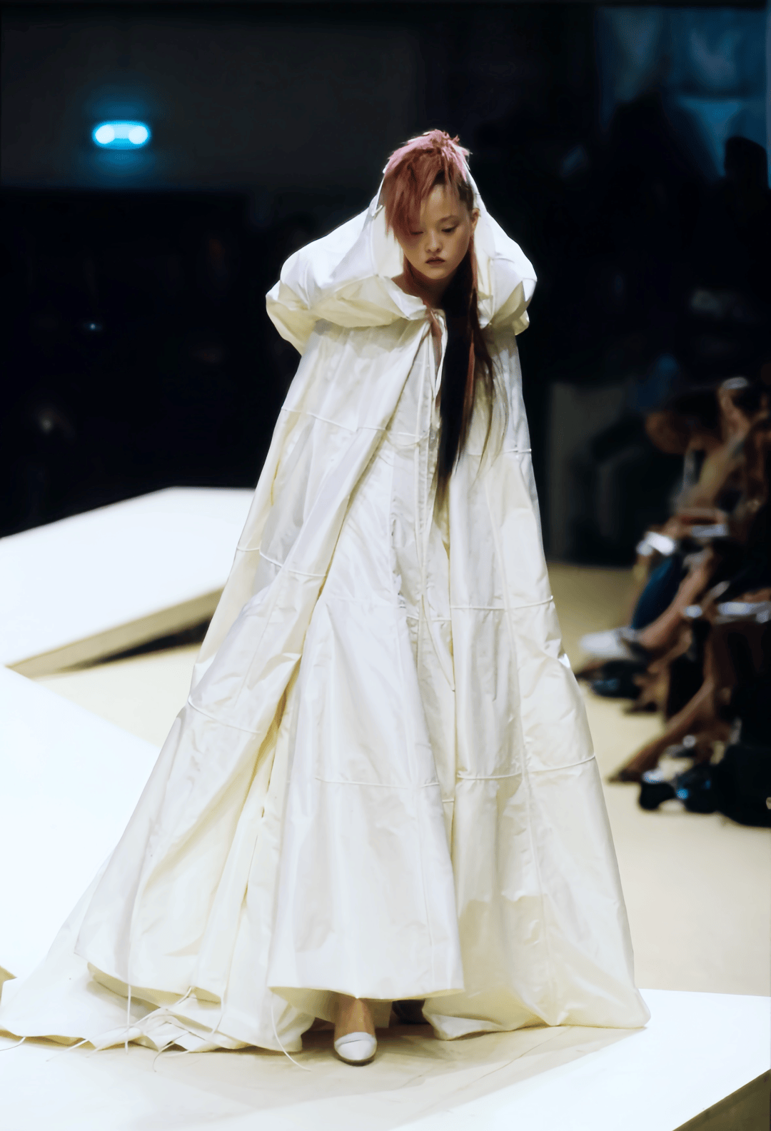 香奈儿 1999/2000 秋冬高级定制时装秀,是戴文青木初次承当香奈儿高定压轴模特。她身穿记号性的兜帽新娘大氅,搭配粉色莫霍克发型,至今仍是经典画面。▼