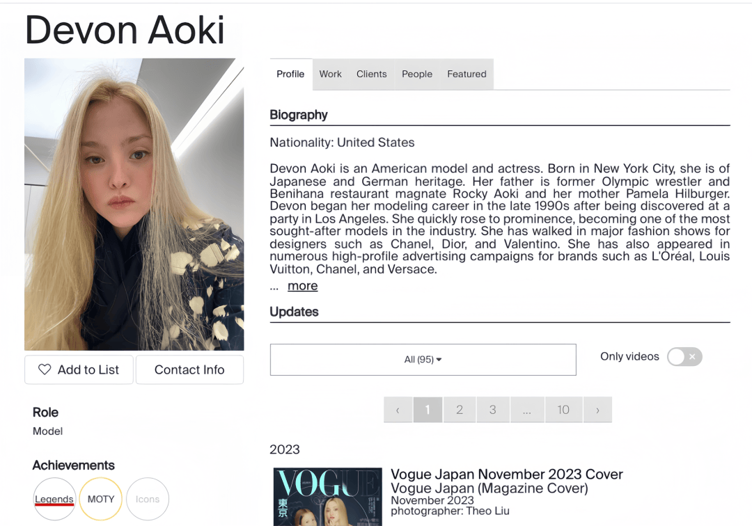2024 年,她被业界最巨头的模特排行榜评为“Legends 传奇超模”,也是这一榜单中,独一具有东方血统的模特。▼